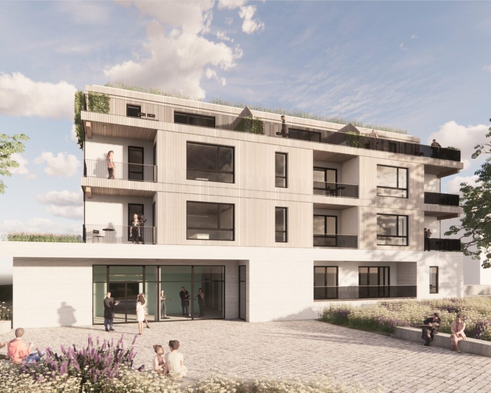 Neubau von zwei Wohnhäusern mit integrierter KiTa und Tiefgarage. Staffelgeschoss in Massivholzbauweise.